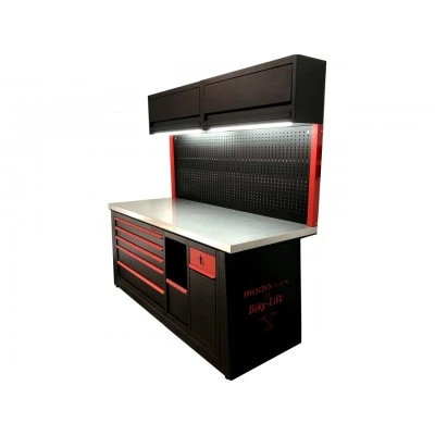 La línea MODOFLEX, fabricada íntegramente en Italia, ha alcanzado excelentes estándares de calidad en los últimos años y es apreciada mundialmente por la calidad de los materiales y la versatilidad modular. Este puesto de trabajo es específico para el mundo de la bicicleta, de 1,62m de anchura, con encimera de hierro y cubierta de protección, un gran panel perforado portaherramientas y 2 grandes armarios aereos con puertas abatibles mediante sistema de pistones hidráulicos. Ofrece un gran espacio de trabajo iluminado por 2 potentes tiras de luz LED.